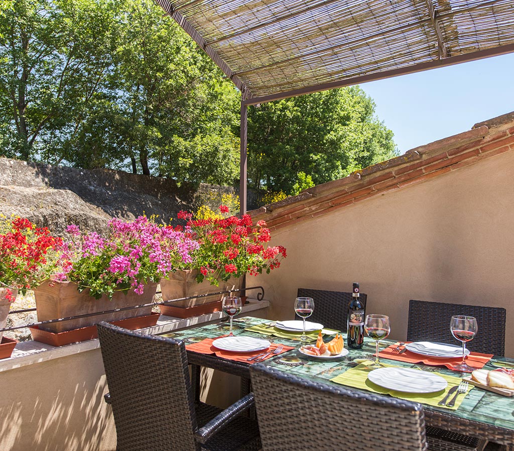 Ingresso indipendente con grande terrazza attrezzata con tavolo, sedie e ombrellone.